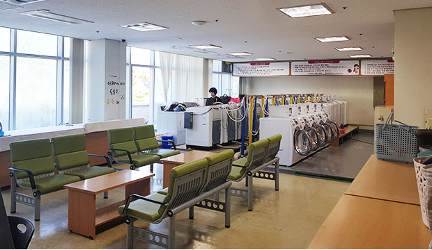 세탁실에서는 셀프 세탁이 가능하고 위탁세탁도 가능합니다. [요금]세탁:1,000원~1,500원 / 건조:1,000원 / 위탁세탁:4,000원