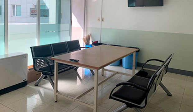 휴게실에서는 텔레비전, 정수기, 씽크대, 냉장고, 냉난방기 등이 구비되어 있습니다.