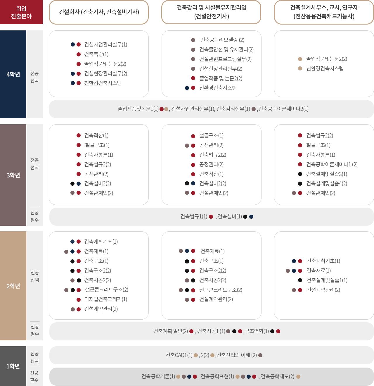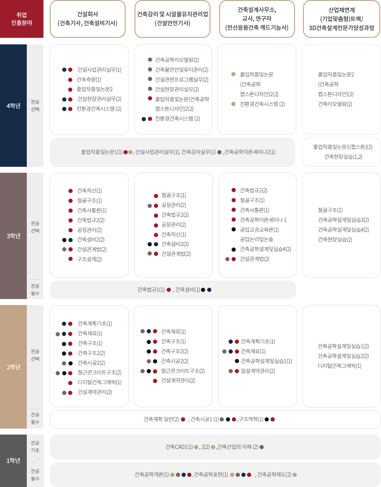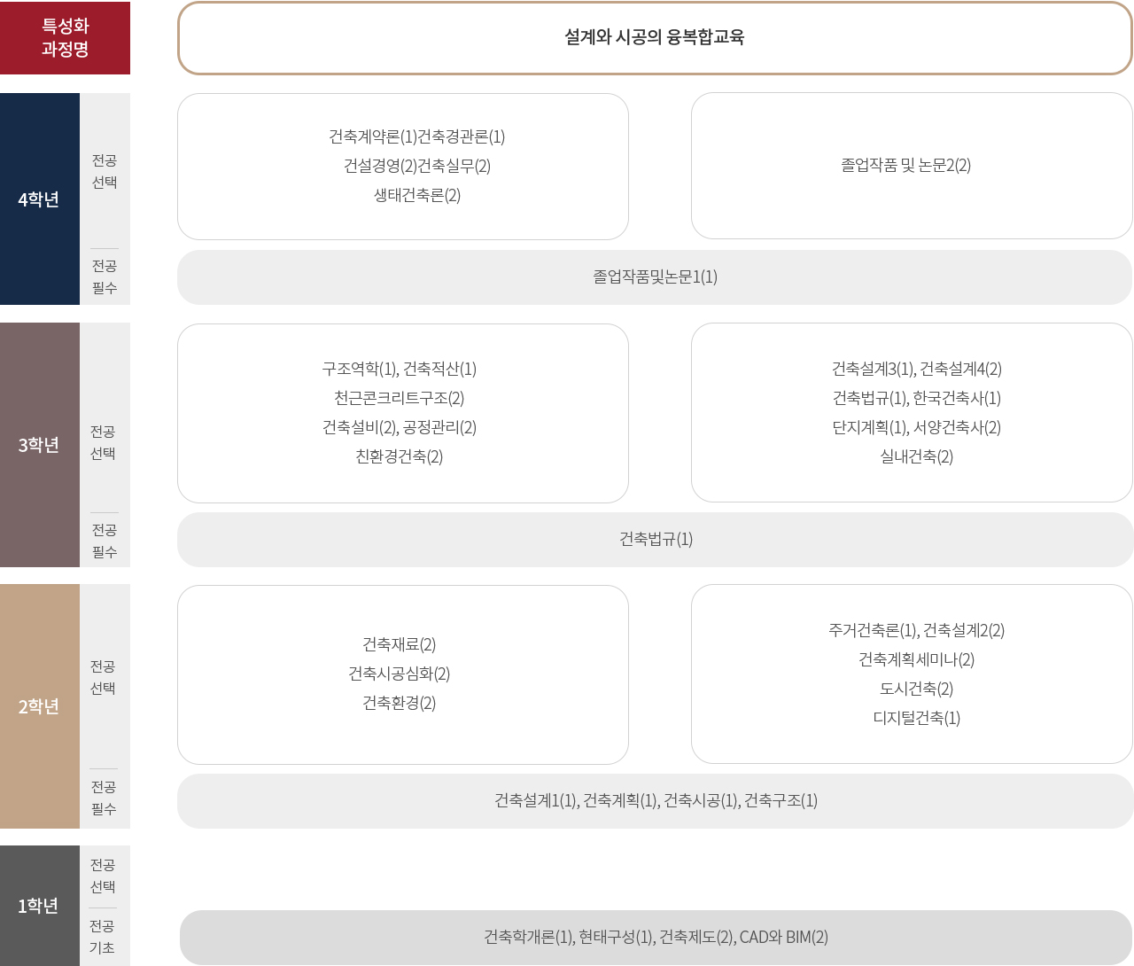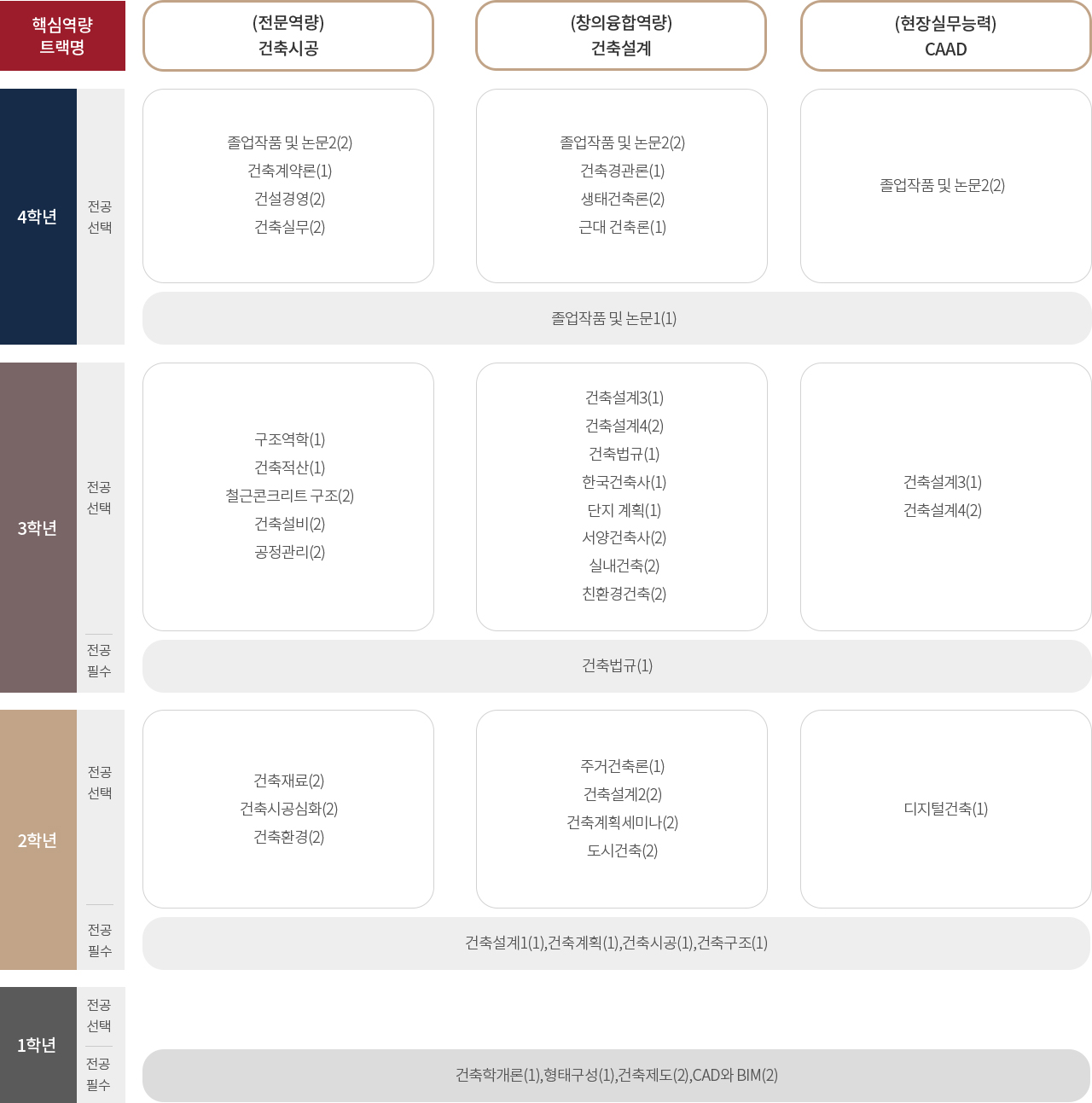 | CAAD | [CAD,BIM 중점교육] 시공과 설계 양쪽 분야에서 활용 가능한 CAD, BIM 활용 가능 인력을 양성함. |