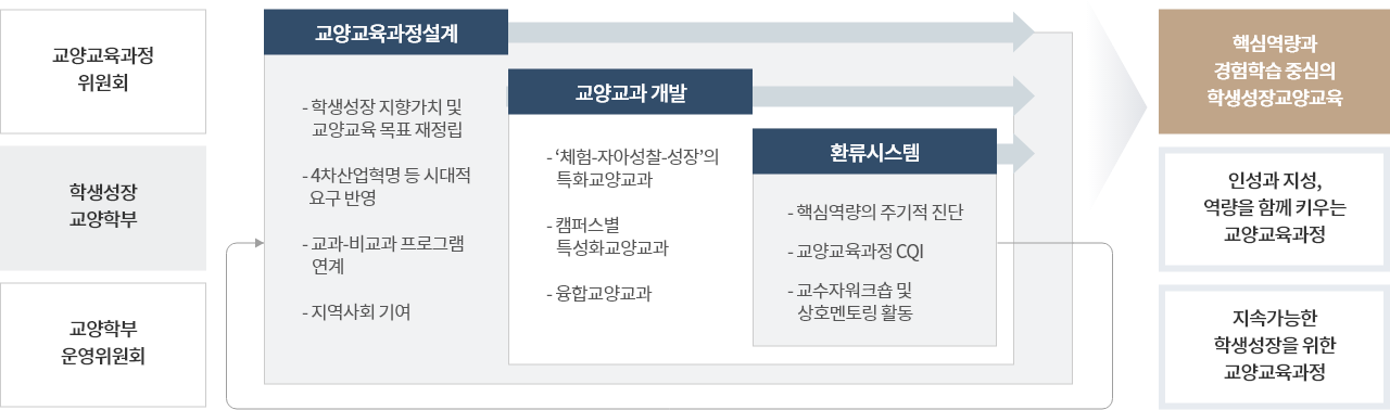- '학생성장대학' 비전 달성을 위해 교양교육의 목표를 '성장과 행복을 지향하는 바르고 유능한 인재 양성'으로 새롭게 정립하고, 인성과 지성, 역량을 함께 키우는 교양교육과정, 지속가능한 학생성장을 위한 교양교육과정으로의 본질적인 변화를 추진하면서 학생성장 지향가치를 구현한 중점 및 특화교양, 캠퍼스별 특성화 전략에 맞춘 소양교육인 특성화교양, 이종학문간 융합교양 등 교양교육과정을 다양하게 개발·운영
