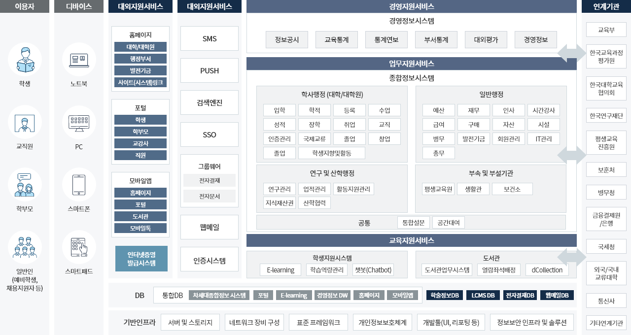 - 사용자 맞춤형 서비스 제공을 위한 스마트 캠퍼스 환경 구축 및 학생, 연구 및 행정 업무의 표준화 및 업무처리의 효율성과 편의성 제고